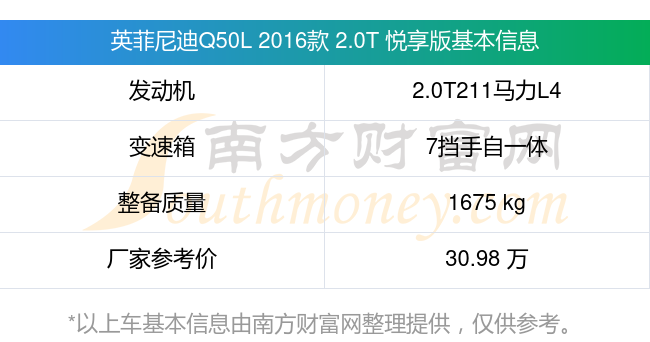 英菲尼迪Q50L 2016款 2.0T 悅享版動力方面,搭載的是一臺2.0T211馬力L4渦輪增壓發(fā)動機,匹配7擋手自一體自動檔變速箱,燃料形式為汽油,常規(guī)整備質(zhì)量1675kg,廠家參考價30.98萬元。