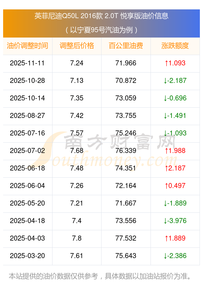 根據(jù)11月11日95號汽油最新調(diào)整價格7.24元/升來計算(以寧夏為例),該車型每百公里的平均油費是71.966元,上一輪10月28日調(diào)整價格7.13元每升來計算,每百公里的平均油費是70.872元,對比上一輪多花1.093元,下一輪的油價調(diào)整時間是11月24日24時。