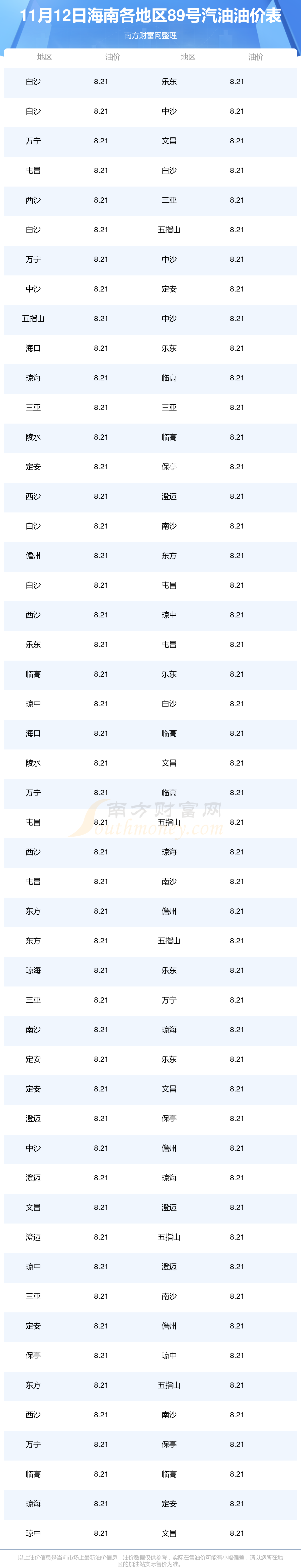 11月12日,海南89號汽油的價格是7.44元每升,本次的調(diào)整時間為11月11日,對比上次的調(diào)整上升了0.09元,上升1.224%,下次調(diào)整時間為11月24日24時,還有12.44天。