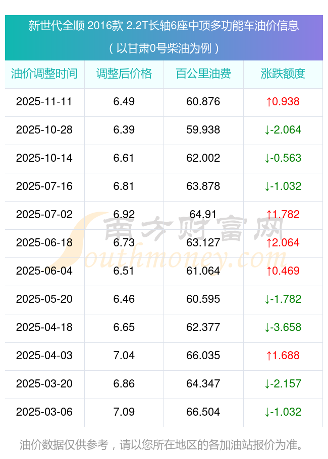 根據(jù)11月11日0號柴油最新調(diào)整價(jià)格6.49元/升來計(jì)算(以甘肅為例),該車型每百公里的平均油費(fèi)是60.876元,上一輪10月28日調(diào)整價(jià)格6.39元每升來計(jì)算,每百公里的平均油費(fèi)是59.938元,對比上一輪多花0.938元,下一輪的油價(jià)調(diào)整時(shí)間是11月24日24時(shí)。