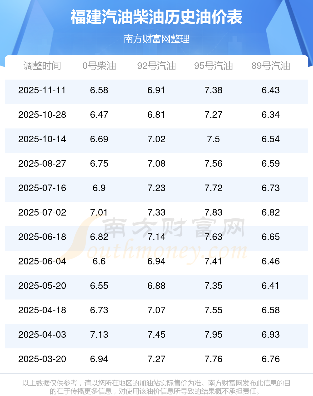 11月12日,福建92號(hào)汽油的價(jià)格是6.91元每升,本次的調(diào)整時(shí)間為11月11日,對(duì)比上次的調(diào)整升了0.1元,升1.468%,下次調(diào)整時(shí)間為11月24日24時(shí),還有12.39天。