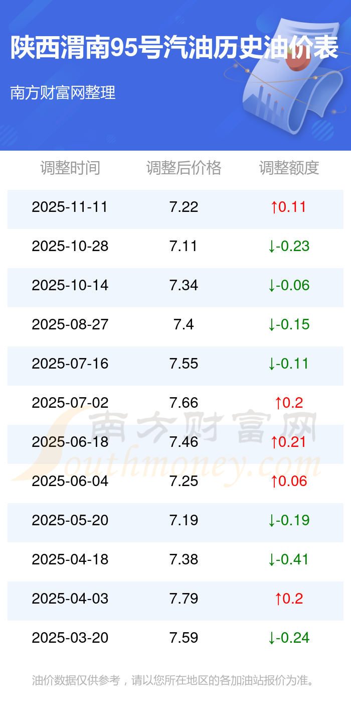 11月12日陜西渭南95號汽油的價格為11月11日油價調(diào)整后的價格,每升7.22元,對比上一輪油價調(diào)整時間10月28日的價格7.11元每升,升了0.11元,升幅達1.547%。下一輪油價調(diào)整時間11月24日24時,距離現(xiàn)在還有12.37天。