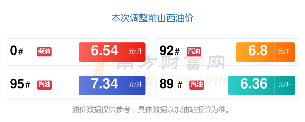 油價(jià)數(shù)據(jù)僅供參考,請(qǐng)以您所在地區(qū)的加油站報(bào)價(jià)為準(zhǔn)。南方財(cái)富網(wǎng)發(fā)布此信息的目的在于傳播更多信息,對(duì)使用該油價(jià)信息所導(dǎo)致的結(jié)果概不承擔(dān)任何責(zé)任。