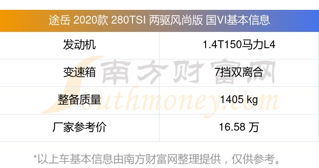 途岳 2020款 280TSI 兩驅(qū)風尚版 國VI動力上配備的是一臺1.4T150馬力L4渦輪增壓發(fā)動機,匹配的是7擋雙離合自動檔變速箱,燃料形式為汽油,常規(guī)整備質(zhì)量1405kg,廠家參考價16.58萬元。