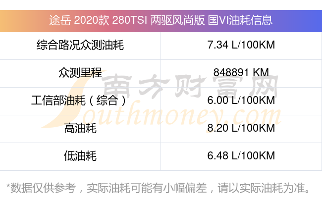 根據(jù)車主實測數(shù)據(jù),該車型低油耗為6.48升每百公里,高油耗為8.20升每百公里,綜合路況眾測油耗為7.34升每百公里,工信部綜合油耗為6.00升每百公里。