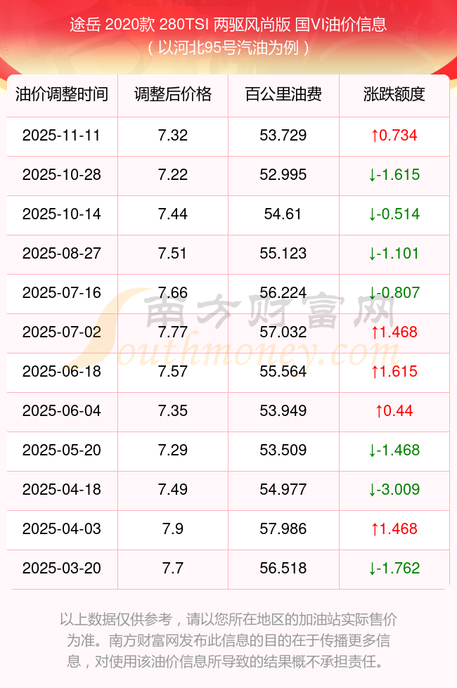 按照11月11日95號汽油最新調(diào)整價格7.32元/升來計算(以河北為例),該車型百公里平均油費為53.729元,按照上一輪10月28日調(diào)整價格7.22元/升來計算,百公里平均油費為52.995元,對比上一輪多花0.734元,下一輪油價調(diào)整時間為11月24日24時。