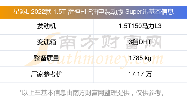 星越L 2022款 1.5T 雷神Hi·F油電混動版 Super迅搭載了一臺1.5T150馬力L3渦輪增壓發(fā)動機(jī),采用3擋DHT自動檔變速箱,常規(guī)整備質(zhì)量1785kg,廠家參考價17.17萬元。