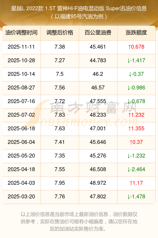 按照11月11日95號汽油最新調(diào)整價格7.38元/升來計(jì)算(以福建為例),該車型百公里平均油費(fèi)為45.461元,按照上一輪10月28日調(diào)整價格7.27元/升來計(jì)算,百公里平均油費(fèi)為44.783元,對比上一輪多花0.678元,下一輪油價調(diào)整時間為11月24日24時。