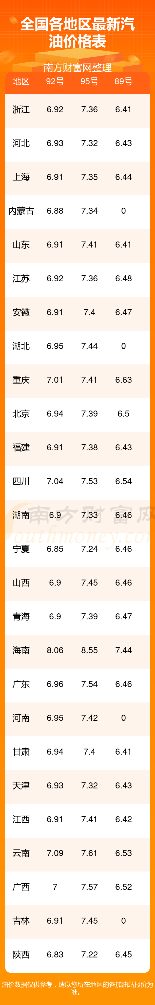油價(jià)數(shù)據(jù)僅供參考,請(qǐng)以您所在地區(qū)的加油站報(bào)價(jià)為準(zhǔn)。南方財(cái)富網(wǎng)發(fā)布此信息的目的在于傳播更多信息,對(duì)使用該油價(jià)信息所導(dǎo)致的結(jié)果概不承擔(dān)任何責(zé)任。