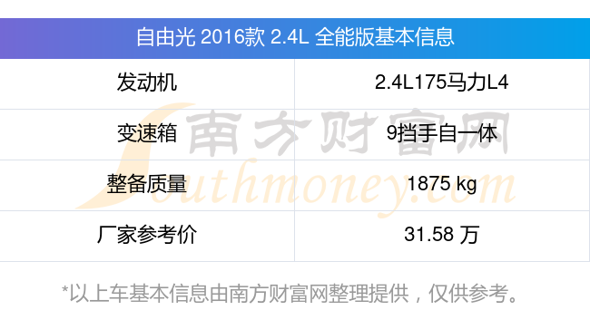 自由光 2016款 2.4L 全能版動(dòng)力上配備的是一臺(tái)2.4L175馬力L4自然吸氣發(fā)動(dòng)機(jī),匹配的是9擋手自一體自動(dòng)檔變速箱,燃料形式為汽油,常規(guī)整備質(zhì)量1875kg,廠家參考價(jià)31.58萬(wàn)元。
