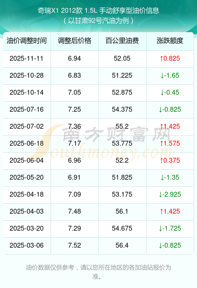 依照11月11日92號汽油最新調(diào)整價格6.94元/升來計算(以甘肅為例),該車型百公里的平均油費(fèi)是52.05元,依照上一輪10月28日調(diào)整價格6.83元/升來計算,百公里的平均油費(fèi)是51.225元,對比上一輪多花0.825元,下一輪的油價調(diào)整時間11月24日24時。