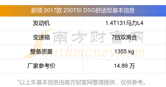 蔚領(lǐng) 2017款 230TSI DSG舒適型動(dòng)力方面,搭載的是一臺(tái)1.4T131馬力L4渦輪增壓發(fā)動(dòng)機(jī),匹配7擋雙離合自動(dòng)檔變速箱,燃料形式為汽油,常規(guī)整備質(zhì)量1355kg,廠家參考價(jià)14.89萬元。