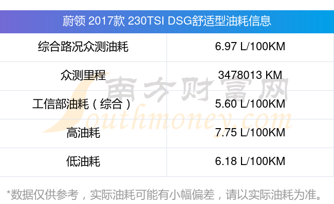 根據(jù)多位車主實(shí)測(cè)得出數(shù)據(jù),該車型低油耗為6.18升/百公里,高油耗為7.75升/百公里,綜合路況眾測(cè)油耗為6.97升/百公里,工信部綜合油耗為5.60升/百公里。