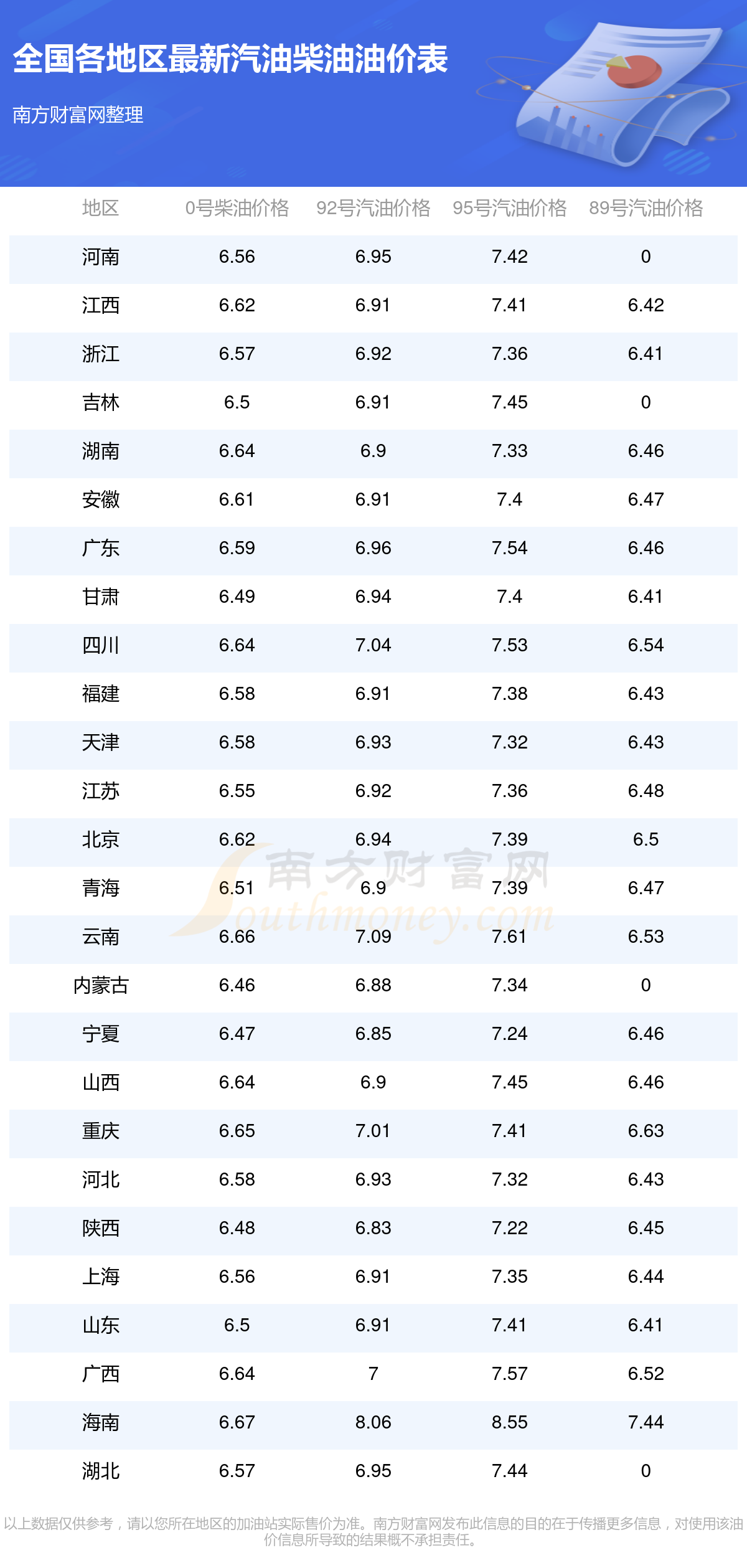 全國各地區(qū)2025年最新汽油價(jià)格表