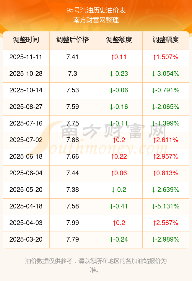 11月12日汽油每升的價格為11月11日調(diào)整后的價格,具體價格如下:92號汽油6.91元;95號汽油7.41元;89號汽油6.41元;0號柴油6.5元。下一輪油價調(diào)整時間11月24日24時,距離現(xiàn)在還有12.32天。