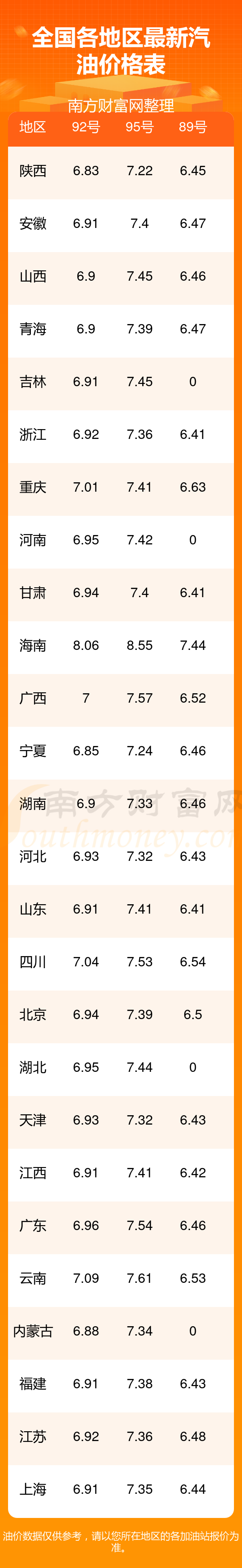本次油價的調(diào)整時間為11月11日,調(diào)整后全國92號汽油平均價格為7元每升,其中,最低的是陜西,6.83元每升,最高的是海南,8.06元每升。全國95號汽油平均價格為7元每升,其中,最低的是陜西,7.22元每升,最高的是海南,8.55元每升。全國0號柴油平均價格為:7元每升,其中,最低的是內(nèi)蒙古,6.46元每升,最高的是海南,6.67元每升。全國89號汽油平均價格為7元每升,其中,最低的是浙江,6.41元每升,最高的是海南,7.44元每升。,下一輪油價調(diào)整時間11月24日24時,距離現(xiàn)在還有12.32天。