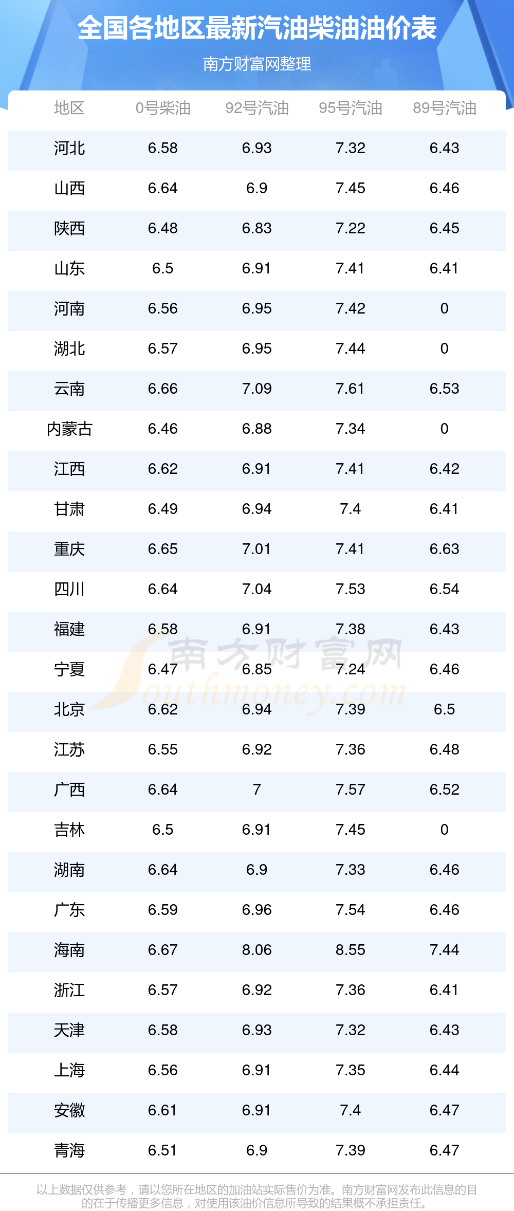 以上數(shù)據(jù)僅供參考,請以您所在地區(qū)的加油站實際售價為準。南方財富網(wǎng)發(fā)布此信息的目的在于傳播更多信息,對使用該油價信息所導致的結(jié)果概不承擔責任。