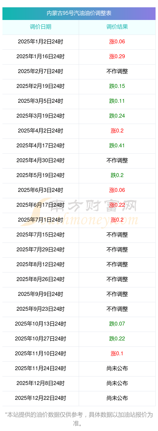 11月12日,內(nèi)蒙古95號(hào)汽油的價(jià)格是7.34元每升,本次的調(diào)整時(shí)間為11月11日,對(duì)比上次的調(diào)整增了0.1元,增1.381%,11月24日24時(shí)為下一輪油價(jià)調(diào)整時(shí)間,還有12.31天。