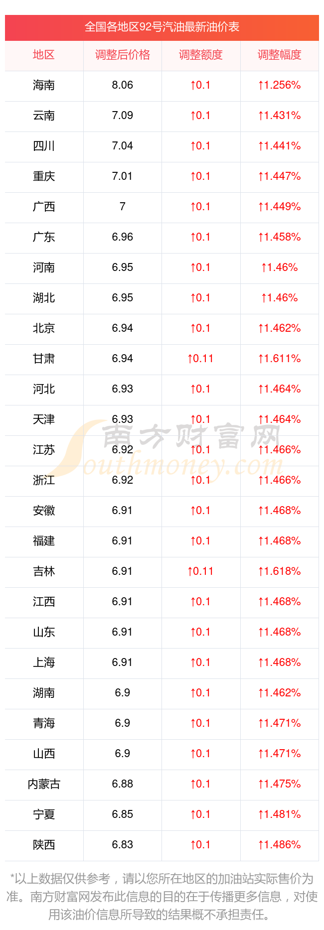 全國各地區(qū)92號汽油油價一覽表