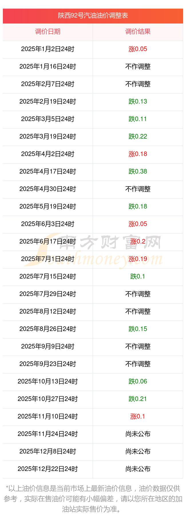 11月12日汽油、柴油價格是11月11日調(diào)整后的價格,每升價格具體為:92號汽油為6.83元,升了0.1元,升幅達1.49%;95號汽油為7.22元,升了0.11元,升幅達1.55%;89號汽油為6.45元,升了0.1元,升幅達1.58%;0號柴油為6.48元,升了0.1元,升幅達1.57%。下一輪油價調(diào)整時間11月24日24時,距離現(xiàn)在還有12.3天。
