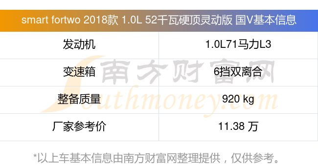在動(dòng)力上,smart fortwo 2018款 1.0L 52千瓦硬頂靈動(dòng)版 國V配備的是一臺(tái)1.0L71馬力L3自然吸氣發(fā)動(dòng)機(jī),匹配的是6擋雙離合自動(dòng)檔變速箱,燃料形式為汽油,常規(guī)整備質(zhì)量920kg,廠家參考價(jià)11.38萬元。
