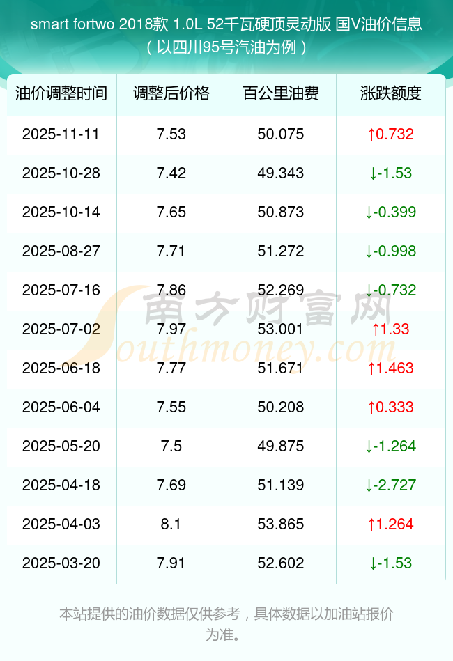 按11月11日95號(hào)汽油最新調(diào)整價(jià)格7.53元每升來計(jì)算(以四川為例),該車型百公里平均油費(fèi)為50.075元,按上一輪10月28日調(diào)整價(jià)格7.42元每升來計(jì)算,百公里平均油費(fèi)為49.343元,對(duì)比上一輪多花0.732元,下一輪油價(jià)調(diào)整時(shí)間為11月24日24時(shí)。