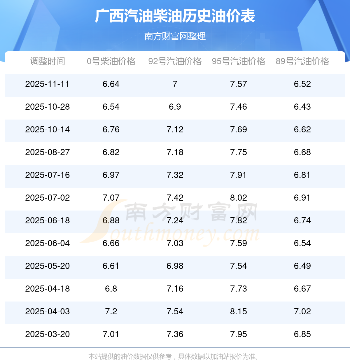 汽油價格調(diào)整最新消息:下一輪油價調(diào)整時間11月24日24時。11月12日,廣西汽油、柴油的價格為11月11日調(diào)整后的價格。具體為:92號汽油7元,上升了0.1元;95號汽油7.57元,上升了0.11元;89號汽油6.52元,上升了0.09;0號柴油6.64元,上升了0.1元。