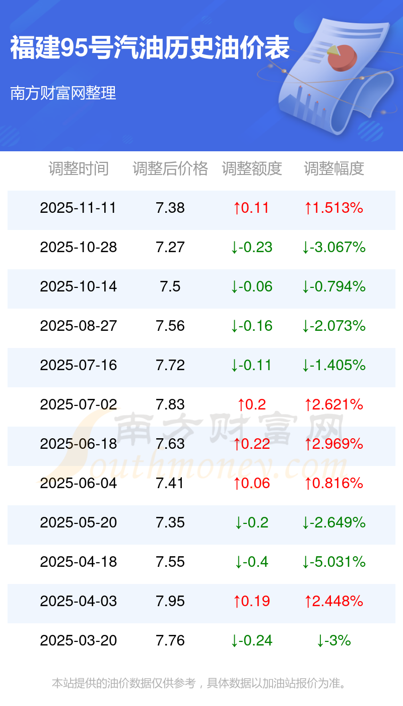 11月12日,福建95號汽油的價格是7.38元每升,本次的調(diào)整時間為11月11日,對比上次的調(diào)整上升了0.11元,上升1.513%,下次調(diào)整時間為11月24日24時,還有12.3天。