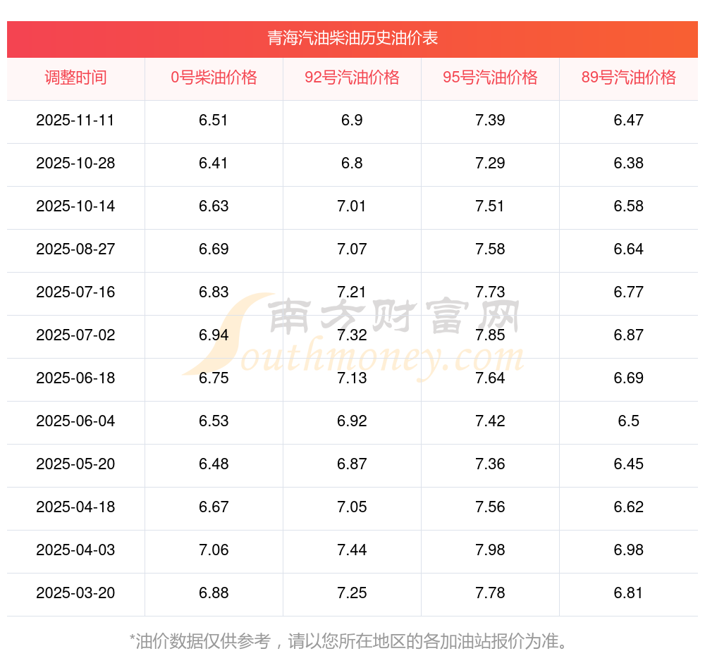 11月12日,青海89號(hào)汽油的價(jià)格是6.47元每升,本次的調(diào)整時(shí)間為11月11日,對(duì)比上次的調(diào)整增了0.09元,增1.411%,11月24日24時(shí)為下一輪油價(jià)調(diào)整時(shí)間,還有12.29天。
