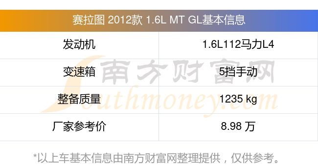 在動力上,賽拉圖 2012款 1.6L MT GL配備的是一臺1.6L112馬力L4自然吸氣發(fā)動機,匹配的是5擋手動擋變速箱,燃料形式為汽油,常規(guī)整備質量1235kg,廠家參考價8.98萬元。