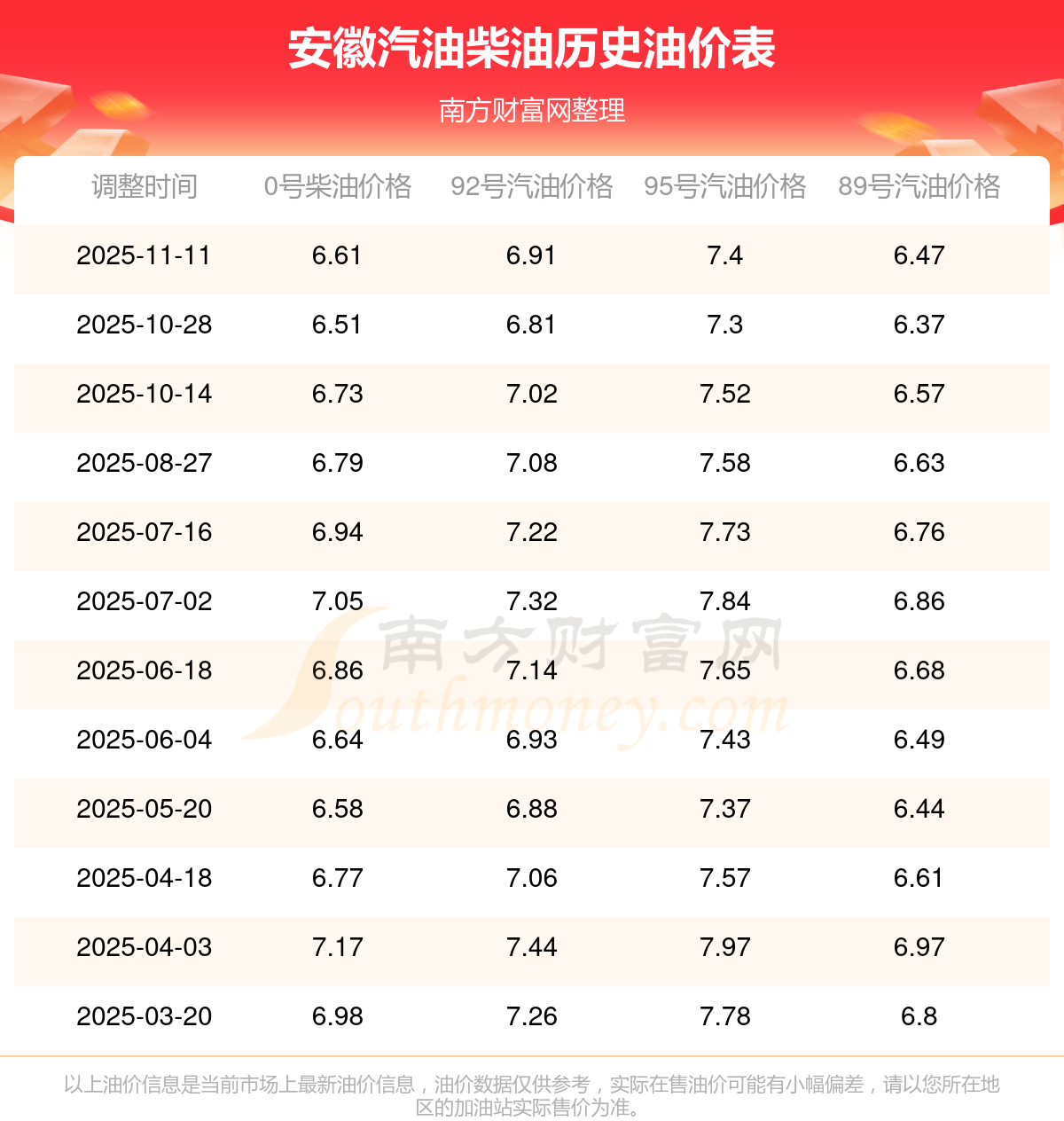 11月12日油價調(diào)整一覽表