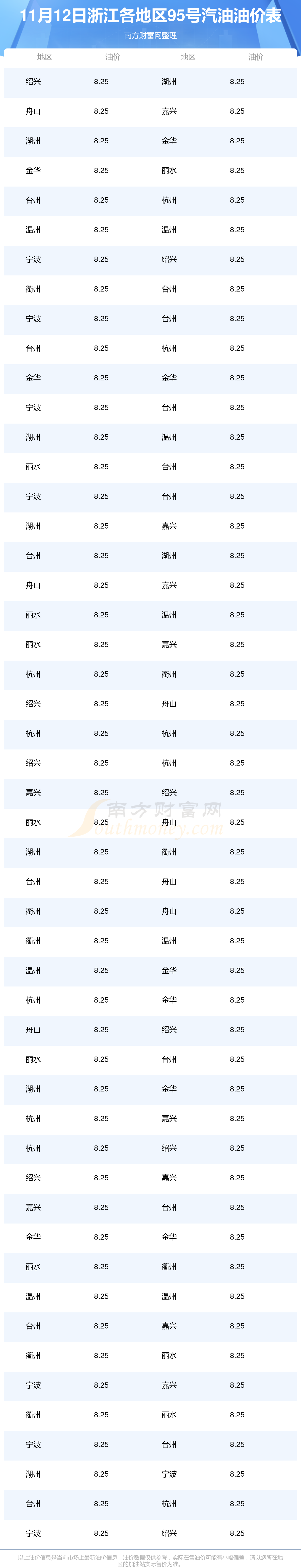 2025年11月12日浙江95號(hào)汽油最新價(jià)格一覽表