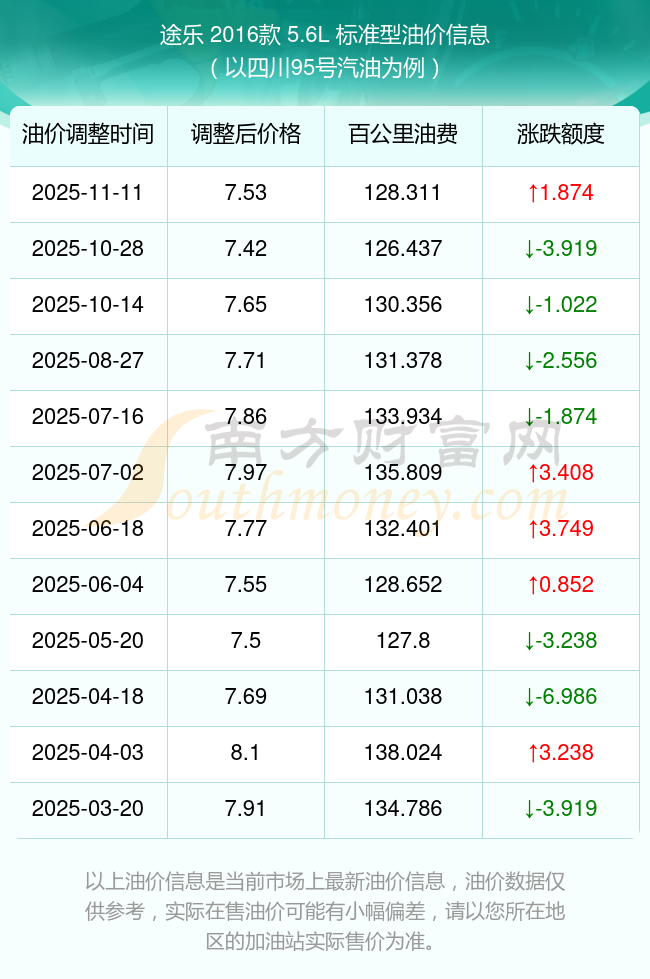 依照11月11日95號(hào)汽油最新調(diào)整價(jià)格7.53元/升來(lái)計(jì)算(以四川為例),該車型百公里的平均油費(fèi)是128.311元,依照上一輪10月28日調(diào)整價(jià)格7.42元/升來(lái)計(jì)算,百公里的平均油費(fèi)是126.437元,對(duì)比上一輪多花1.874元,下一輪的油價(jià)調(diào)整時(shí)間11月24日24時(shí)。