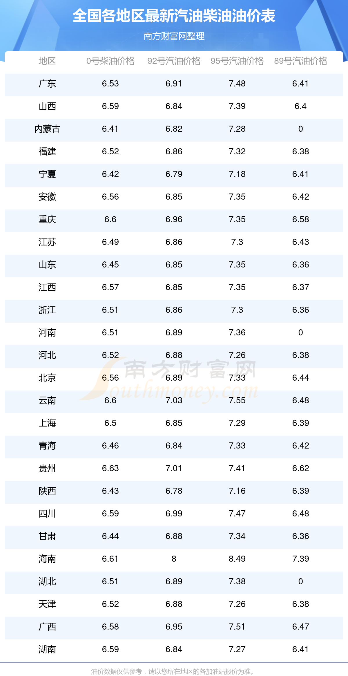 2025年12月3日全國各地汽油價(jià)格表一覽