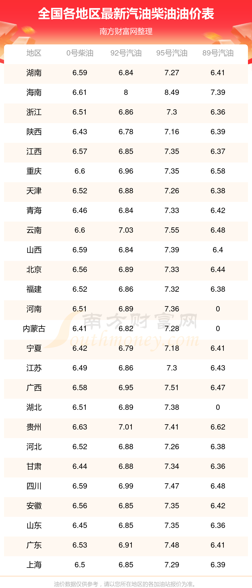 以上數(shù)據(jù)僅供參考,請以您所在地區(qū)的加油站實際售價為準。南方財富網(wǎng)發(fā)布此信息的目的在于傳播更多信息,對使用該油價信息所導致的結(jié)果概不承擔責任。