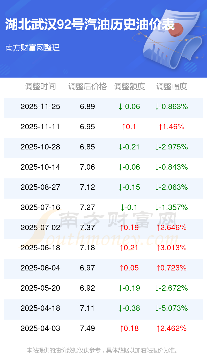 12月3日,湖北武漢92號汽油的價格為6.89元/升,這是11月25日油價調(diào)整后的價格,對比上一輪油價調(diào)整時間11月11日的價格6.95元每升,下降了0.06元,下降幅達0.863%。下一輪油價調(diào)整時間12月8日24時,距離現(xiàn)在還有5.07天。