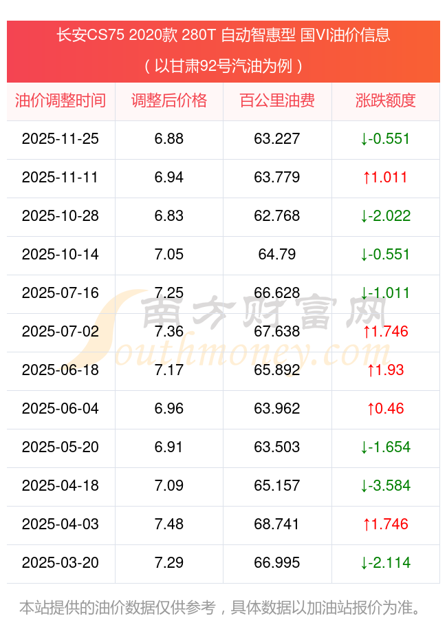 依照11月25日92號(hào)汽油最新調(diào)整價(jià)格6.88元/升來計(jì)算(以甘肅為例),該車型百公里的平均油費(fèi)是63.227元,依照上一輪11月11日調(diào)整價(jià)格6.94元/升來計(jì)算,百公里的平均油費(fèi)是63.779元,對(duì)比上一輪少花0.551元,下一輪的油價(jià)調(diào)整時(shí)間12月8日24時(shí)。