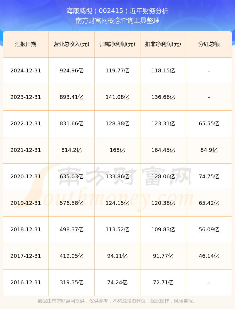 2024年??低暱偁I(yíng)收924.96億,同比增長(zhǎng)3.53%;凈利潤(rùn)119.77億,同比增長(zhǎng)-15.1%;銷售毛利率43.83%。