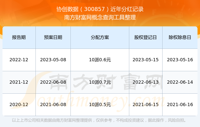 協(xié)創(chuàng)數(shù)據(jù)最新一次公布的分紅方案為10派0.6元。本次權(quán)益分派股權(quán)登記日為2023年5月15日,除權(quán)除息日為2023年5月16日,派息日為2023年5月16日。