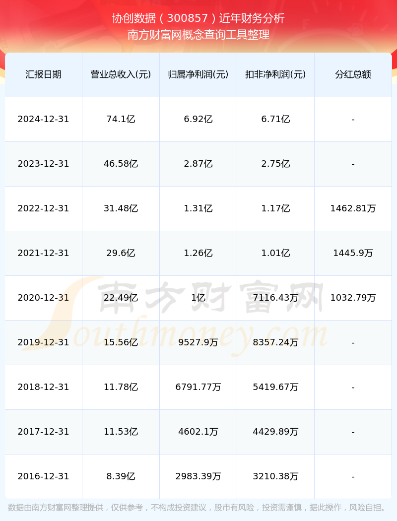 協(xié)創(chuàng)數(shù)據(jù)公司2024年實(shí)現(xiàn)營業(yè)收入74.1億元,同比增長59.08%;凈利潤6.92億元,同比增長140.8%;毛利率17.36%。