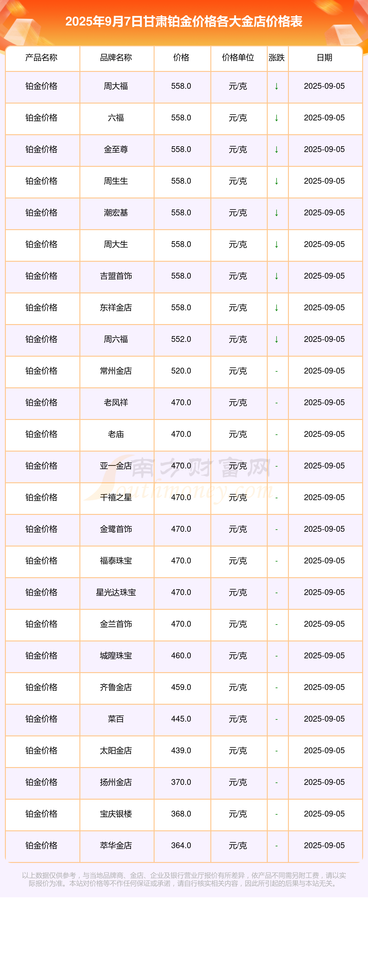 2025年9月7日甘肅各大金店鉑金價格最新價格查詢來了:中國黃金811.9元/克,中國黃金827.9元/克,中國黃金808.9元/克,周大福1060.0元/克,周大福558.0元/克,周大福1060.0元/克,周大福39460.0,周大福16000.0,周大福35620.0,周大福1050.0元/克,老鳳祥1055.0元/克。
