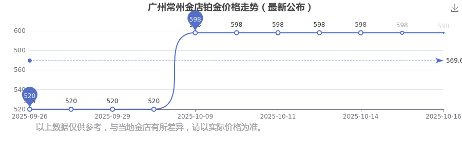 598.0元/克,這是廣州常州金店于 2025年10月16日所定的鉑金價格。