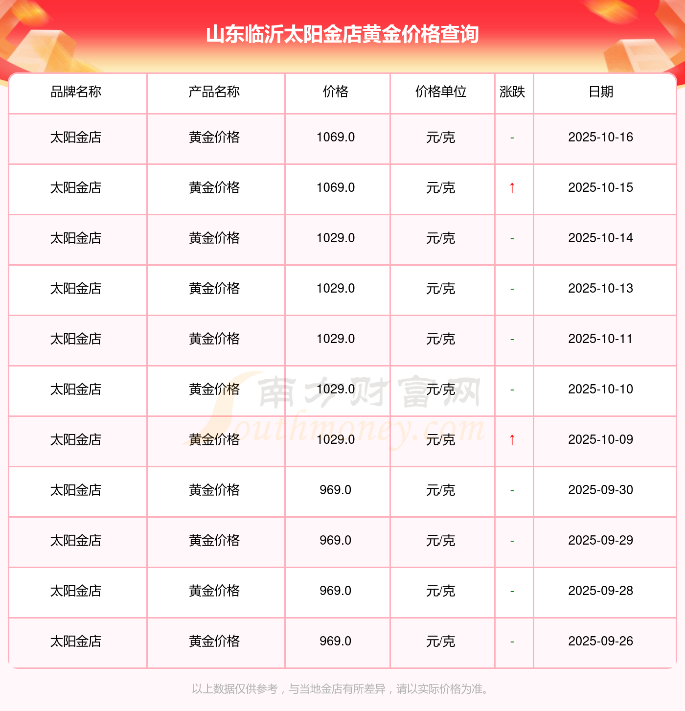 山東臨沂太陽(yáng)金店現(xiàn)在黃金價(jià)格每克多少?求問山東臨沂太陽(yáng)金店今日一克黃金的價(jià)格是多少?(2025-10-16)