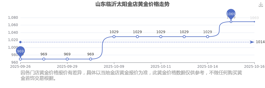 求問山東臨沂太陽(yáng)金店今日一克黃金的價(jià)格是多少?今日山東臨沂太陽(yáng)金店黃金價(jià)格查詢,山東臨沂太陽(yáng)金店 2025年10月16日的黃金價(jià)格價(jià)位為 1069.0元/克。