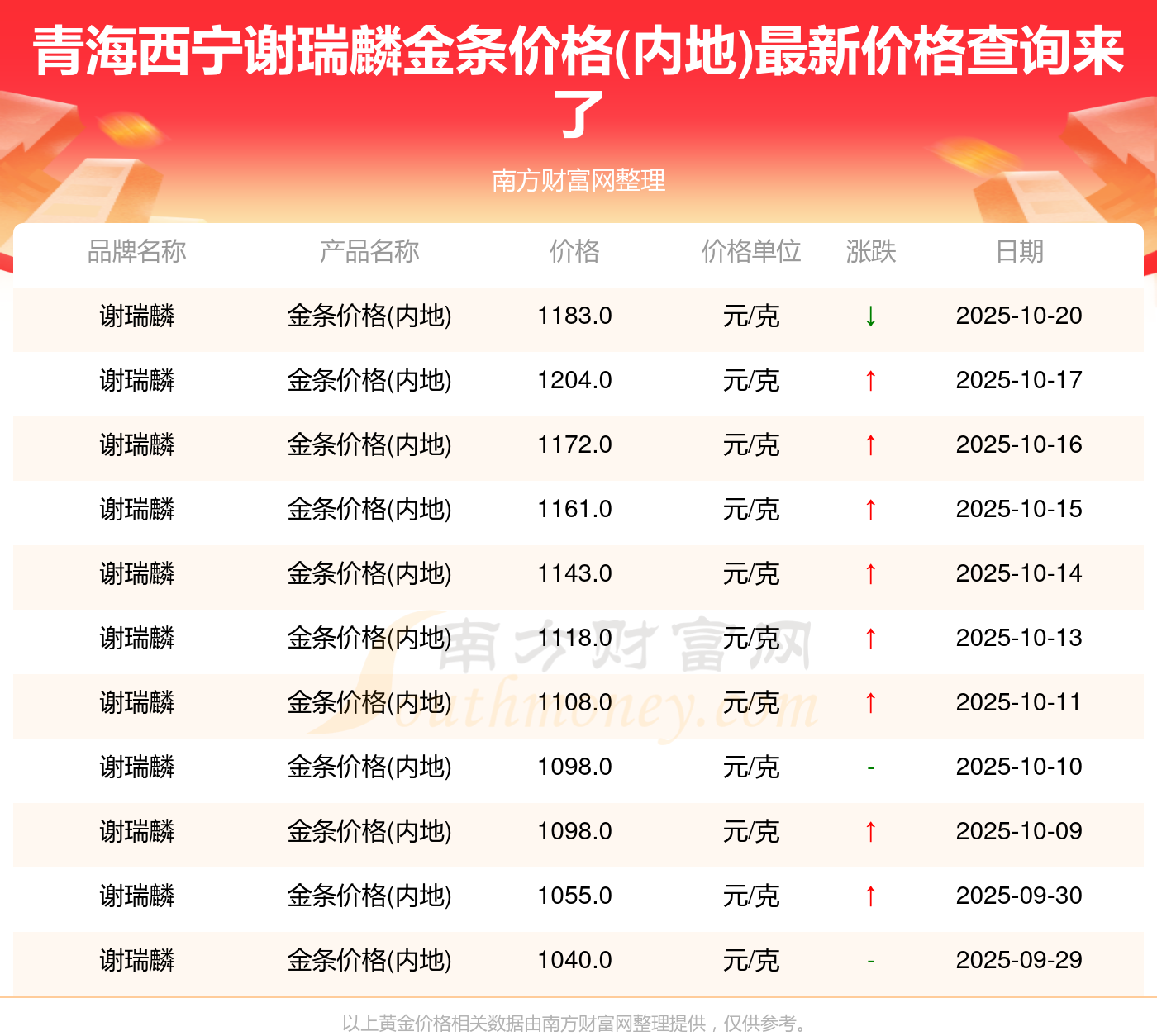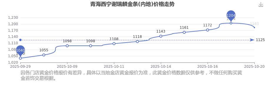 1183.0元/克的金條(內(nèi)地)價(jià)格,是青海西寧謝瑞麟在 2025年10月20日給出的。