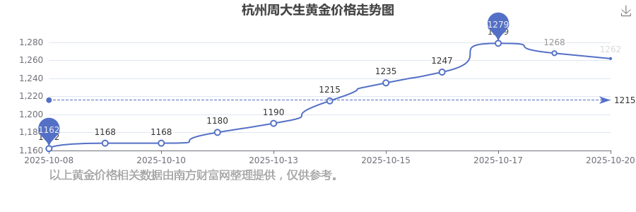 2025年10月20日,杭州周大生黃金價(jià)格每克的售賣價(jià)位為1262.0元/克。