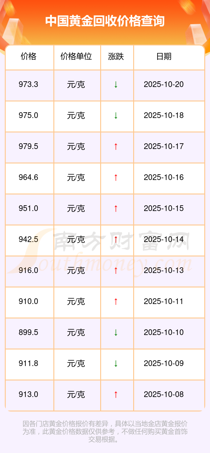 2025年10月21日中國(guó)黃金回收價(jià)格多少一克?最新中國(guó)黃金回收價(jià)格表查詢,一起來(lái)看看吧!
