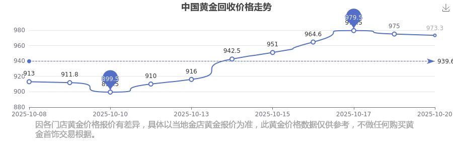 今日(2025年10月21日),中國(guó)黃金回收價(jià)最新價(jià)格為973.3元/克。