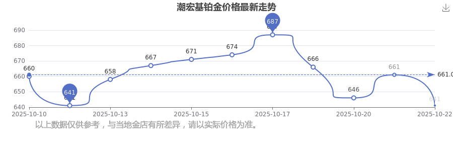 今日潮宏基 鉑金價格最新的克重售價為641.0元/克。