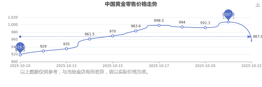 中國(guó)黃金零售價(jià)格每克最新是多少錢?中國(guó)黃金零售價(jià)行情走勢(shì)圖(2025年10月23日)